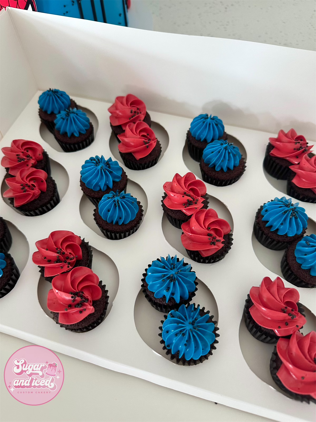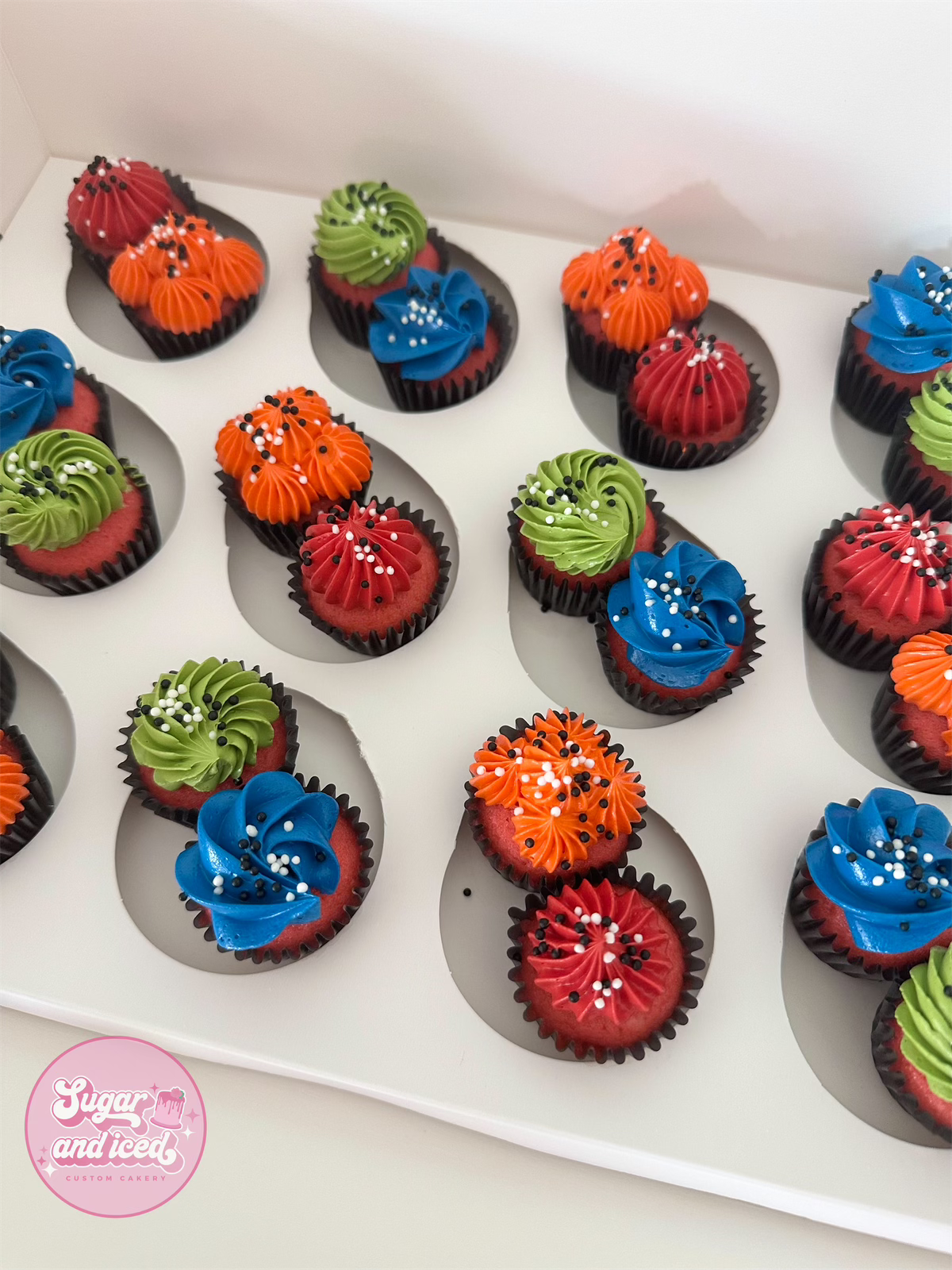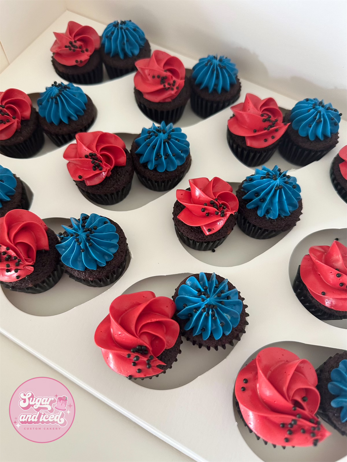 Please note, we don’t make black buttercream so if your colour scheme involves black we will add black sprinkles. If your cupcakes also come with fondant or chocolate decorations we can make these black too.